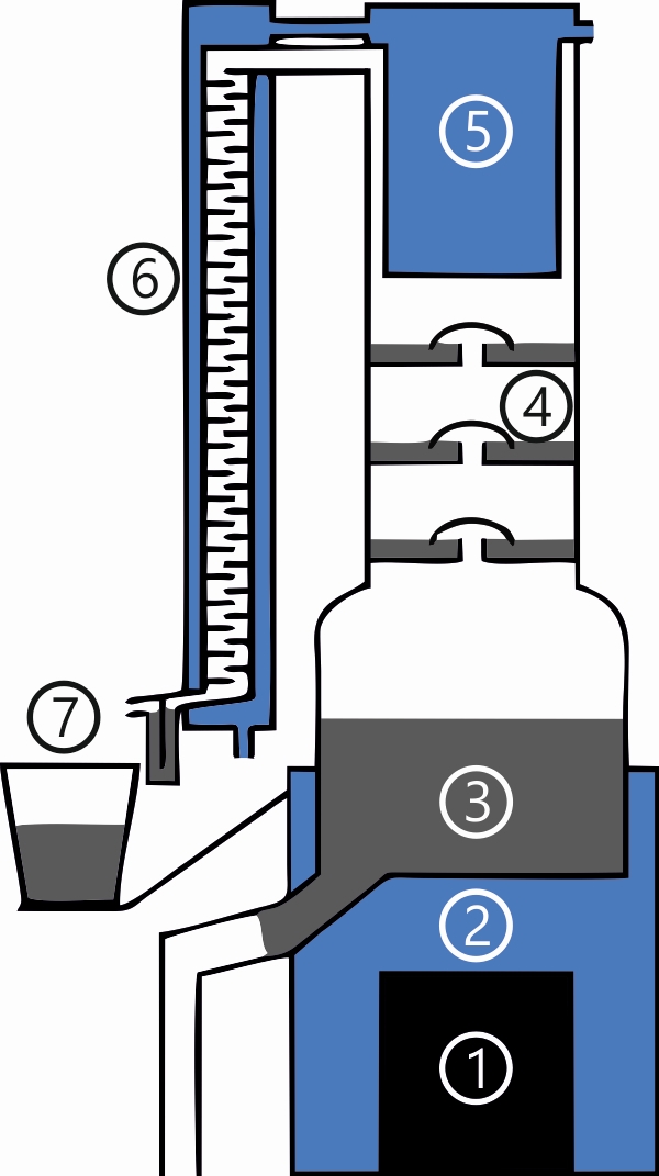 Schließlich erreicht der Dampf den Dephlegmator (5). Um diesen herum muss er nun spiralförmig aufsteigen. Der Dephlegmator ist ein mit Kühlwasser gefüllter Behälter, der die letzte Hürde für den aufsteigenden Dampf darstellt und auch noch einmal den Alkoholgehalt erhöht, weil in ihm noch einmal ein großer Teil des Dampfes kondensiert.